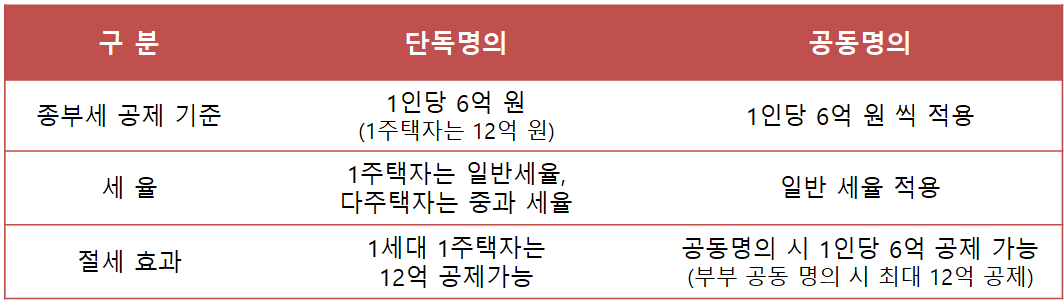 • 다주택자 및 일반 명의자 : 공시가격 6억 원 초과 시 종부세 부과