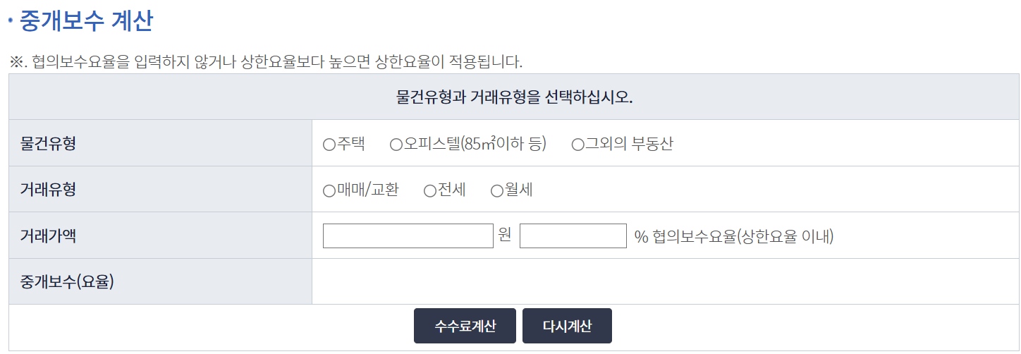 ※ 아래 하단에 있는 서울특별시 서울부동산 정보광장 사이트에서 사전에 중개보수를 계산해 볼 수 있습니다.